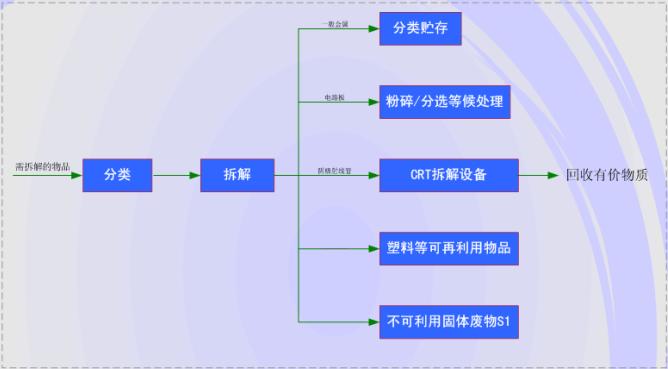 此阶段的步骤为进行废弃物之「回收过磅」、「物料分类」、「组件拆解」、「材质分离」、「杂质去除」及「资源贮存」等动作,经此步骤可先判定资源类别与价值,而后再进入后续处理阶段,可大幅缩短再生时程。